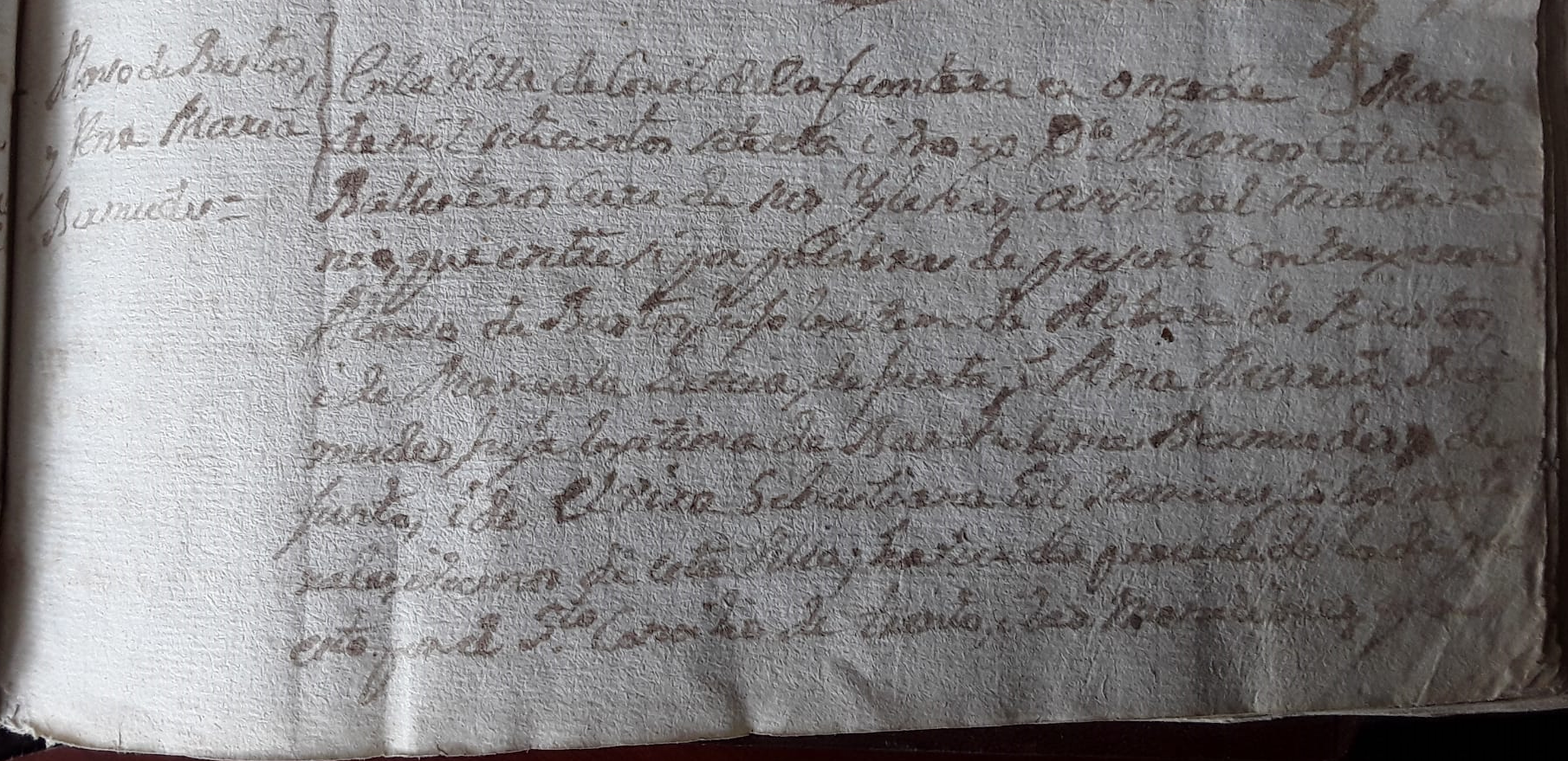 «”ALONSO DE BUSTOS Y ANA MARIA BERMUDEZ.- En la Villa de Conil de la Frontera, en ONCE DE MARZO DE MIL SETECIENTOS SETENTA Y UNO, Yo Don Marcos Cevada Ballesteros, Cura de sus Iglesias, ASISTI A EL MATRIMONIO, que entre si, por palabras de presente CONTRAJERON ALONSO DE BUSTOS, hijo lexitimo de ALBARO DE BUSTOS i de MANUELA GARCIA, defunta; y ANA MARIA BERMUDES, hija lexitima de BARTHOLOME BERMUDEZ, defunto i de ELVIRA SEBASTIANA GIL RAMIREZ, todos naturales i vecinos de esta Villa; havia precedido lo dispueto por el Santo Concilio de Trento, las moniciones que fueron en los dias veinte i cuatro de Febrero proximo pasado, tres i dies de este mes de Marzo, de las que pasadas veinte i cuatro horas, no resulto canonico impedimento alguno, se dispusieron i examinaron, i fueron testigos Antonio Gil, Antonio Lopez i otros vecinos de dicha Villa; lo firmo. = [Aparece la firma y rúbrica de:] Don Marcos Cevada Ballesteros.”» Fuente: Archivo Santa Catalina. Libro Matrimonio N11 (1.771-1.790), Folios 2 y 2v.